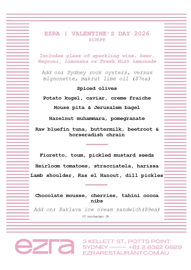 Valetine’s Day is always a vibe at Ezra! Join us for a set menu of our greatest hits, plus a few new dishes for your to try — with a little bump of caviar to top it off.